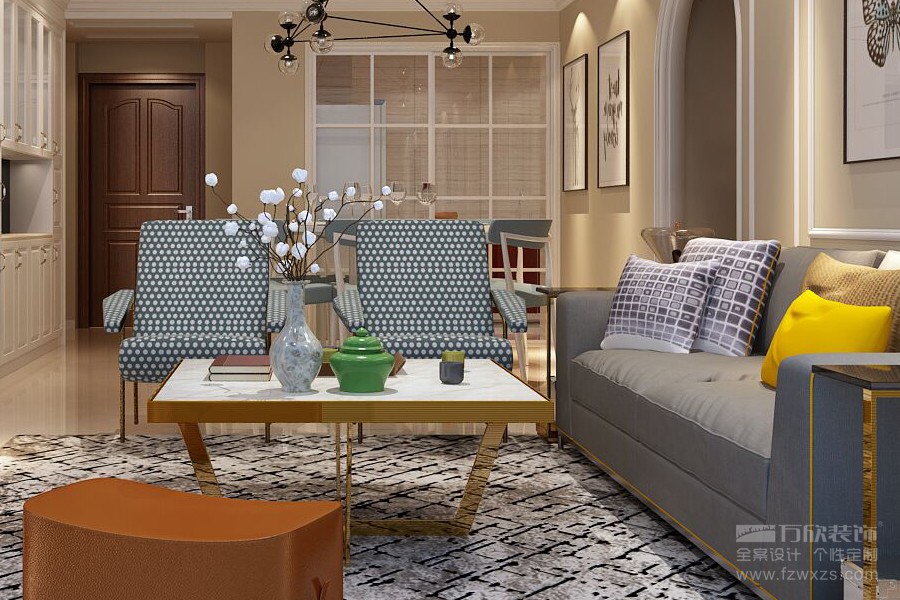 在家具的選擇上,并沒有出現(xiàn)碎花布藝等美式元素,而是選擇了純灰色系沙發(fā)搭配線條利落的古銅色茶幾,讓自然與清新之中不失現(xiàn)代的質(zhì)感簡約。
