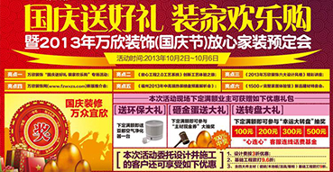 查看詳情正所謂“金九銀十家裝熱”,國慶期間迎來了2013年又一個裝修熱潮。據(jù)悉,萬欣裝飾將于10月2 - 6日推出一場“國慶送好禮,裝家歡樂購”的活動。作為引領(lǐng)福建高品質(zhì)家裝的優(yōu)質(zhì)企業(yè),萬欣裝飾已經(jīng)為榕城業(yè)主準備了屬于自家戶型的家裝預(yù)案,傾情送出國慶裝修好禮,即將拉響福州秋季裝修的領(lǐng)軍號角。