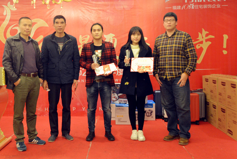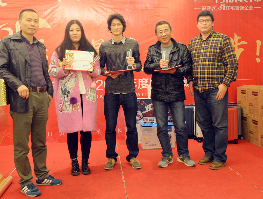 會上,林總、江總及4個部門總監(jiān)對于2016年度中表現突出的團隊、主管、家裝顧問、設計師、監(jiān)理及新人頒發(fā)獎金、證書及獎杯。他們將辛勤的汗水灑下,毫無怨言的付出。此刻,他們熠熠生輝。